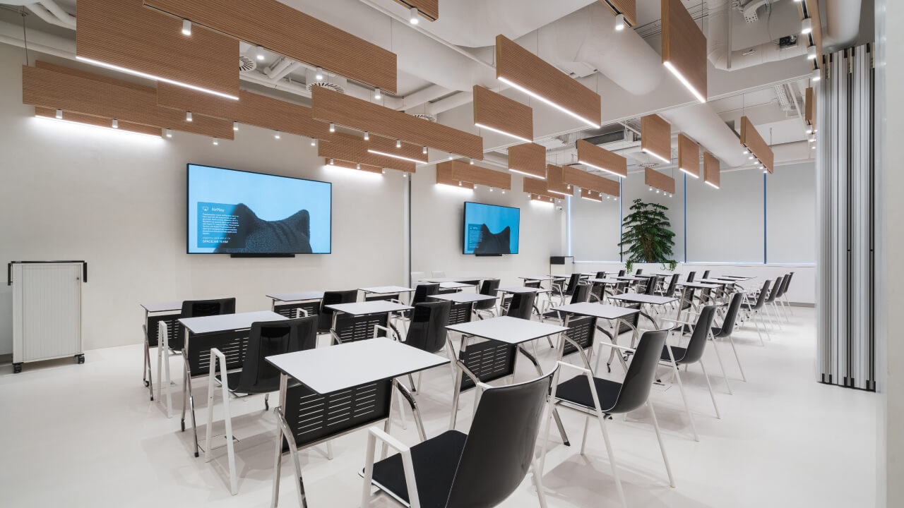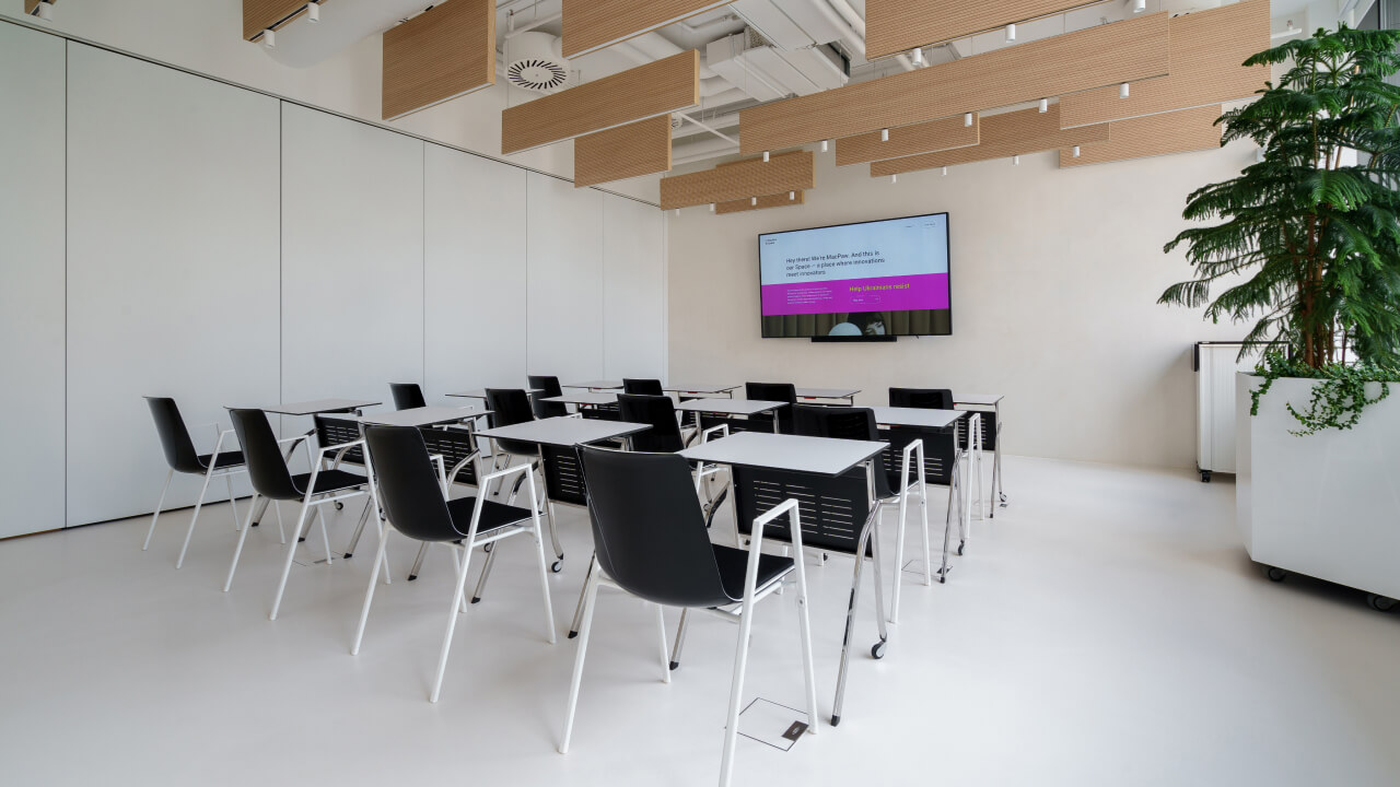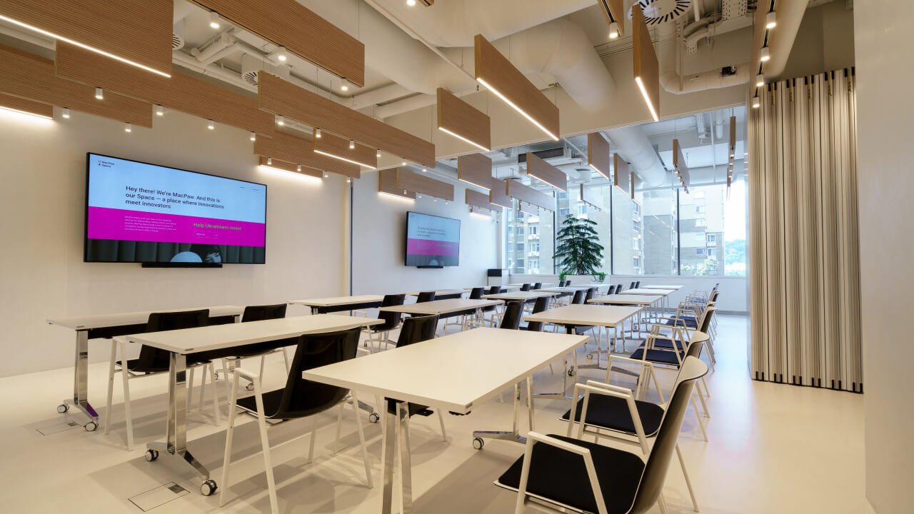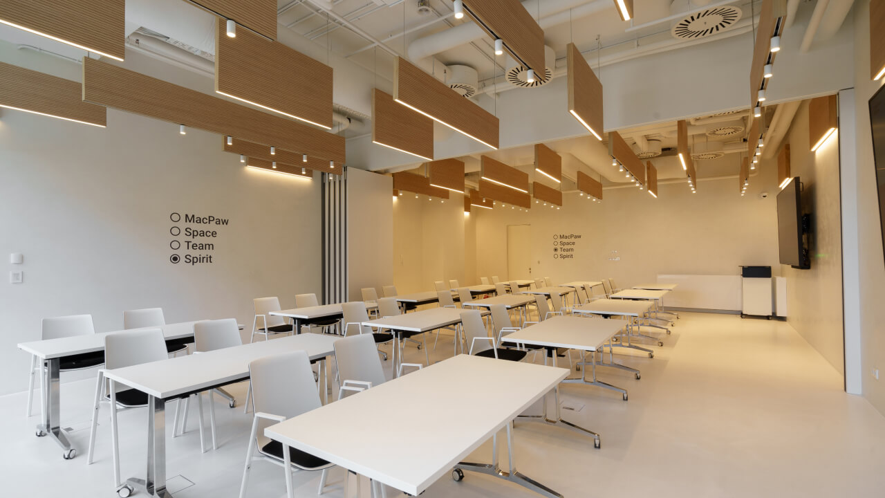 Зробіть свої ідеї прозорими для колег, дозвольте кожному висловитися та будуйте свої проєкти разом. Лаконічний простір Team&Spirit створений для того, щоб зменшити кількість подразників і залишити місце лише для ваших ідей. Пересувайте меблі, малюйте на стінах і робіть усе, що потрібно для справжніх відкриттів. Облаштуйте цей простір так, як ви хочете. Ви можете використовувати всі 100 м2 для командної роботи, хакатонів та лекцій або ж розділити їх розсувною стіною на дві кімнати для творчих воркшопів, затишних стратегічних сесій чи активних дискусій.