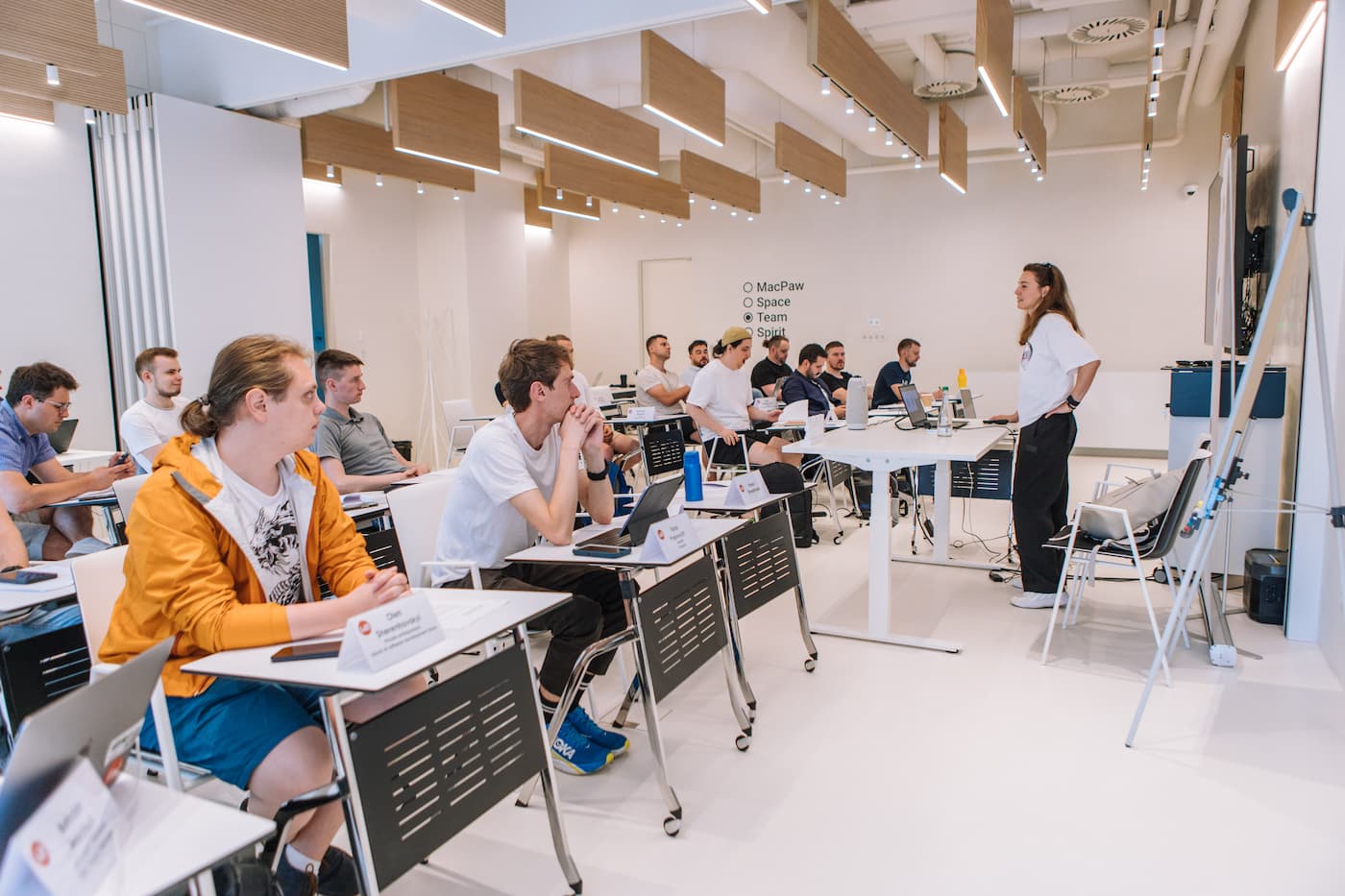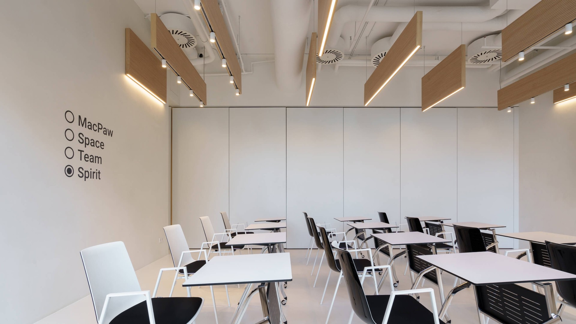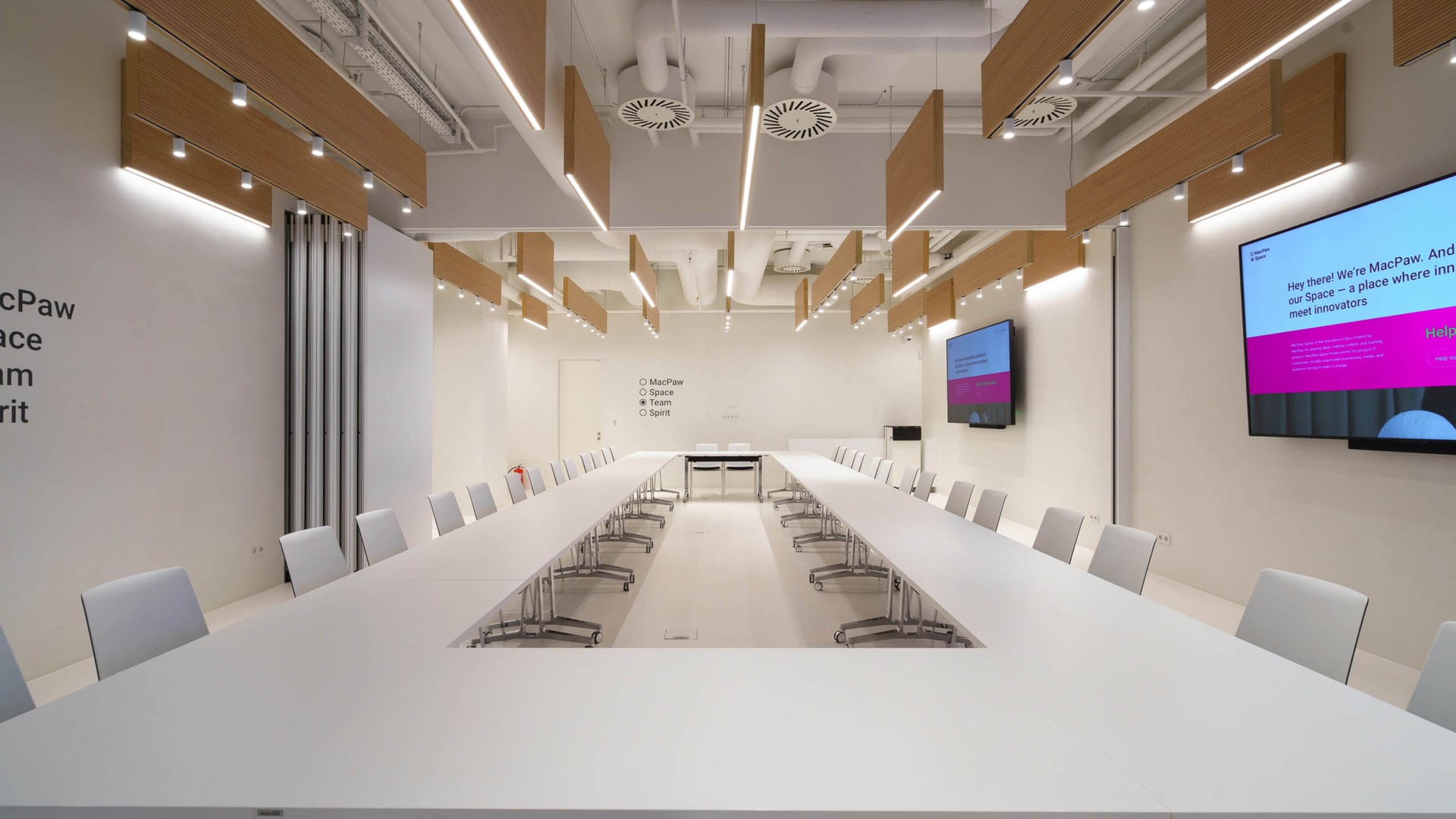 Зробіть свої ідеї прозорими для колег, дозвольте кожному висловитися та будуйте свої проєкти разом. Лаконічний простір Team&Spirit створений для того, щоб зменшити кількість подразників і залишити місце лише для ваших ідей. Пересувайте меблі, малюйте на стінах і робіть усе, що потрібно для справжніх відкриттів. Облаштуйте цей простір так, як ви хочете. Ви можете використовувати всі 100 м2 для командної роботи, хакатонів та лекцій або ж розділити їх розсувною стіною на дві кімнати для творчих воркшопів, затишних стратегічних сесій чи активних дискусій.
